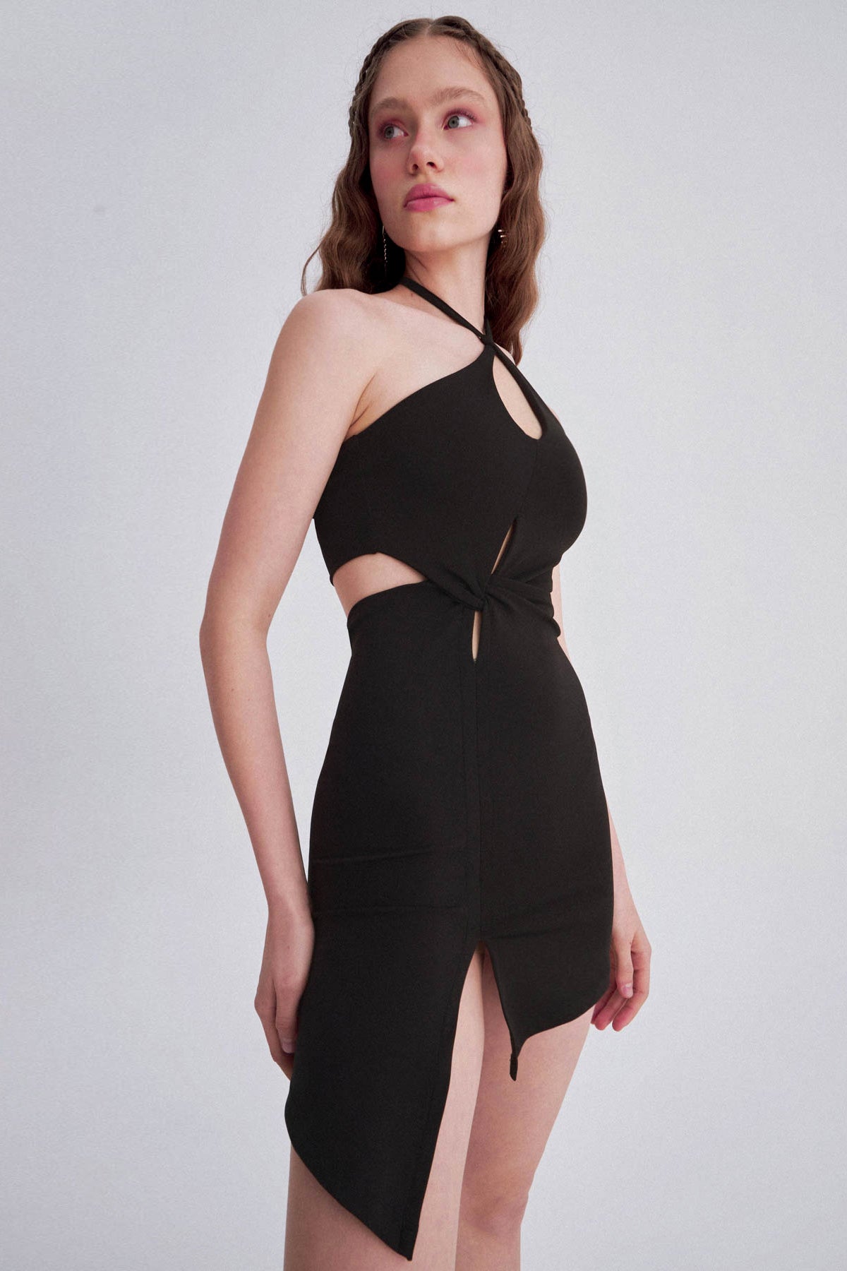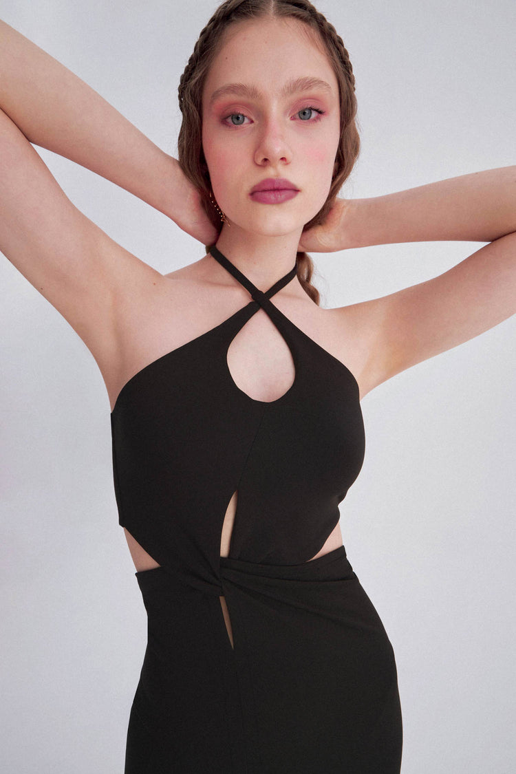 Siyah Asimetrik Detaylı Mini Elbise
