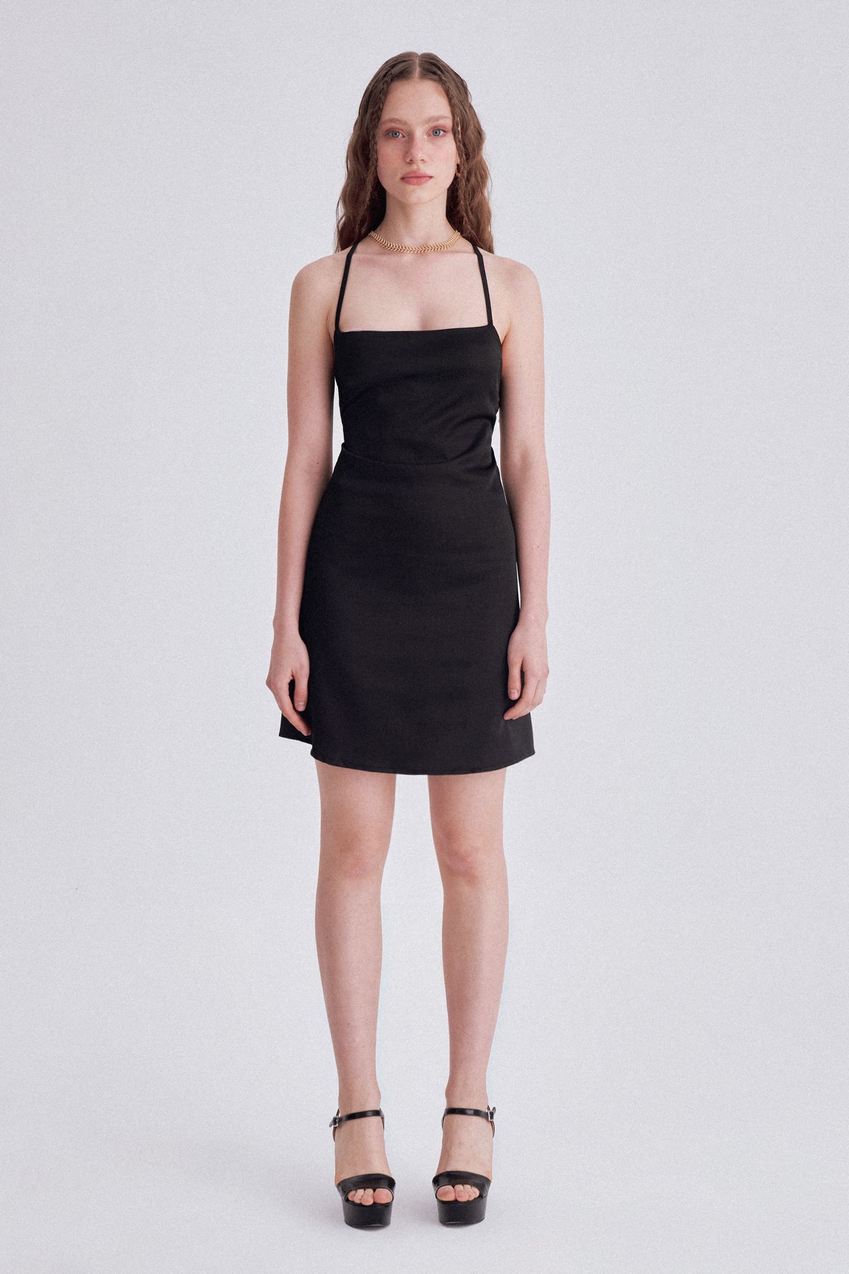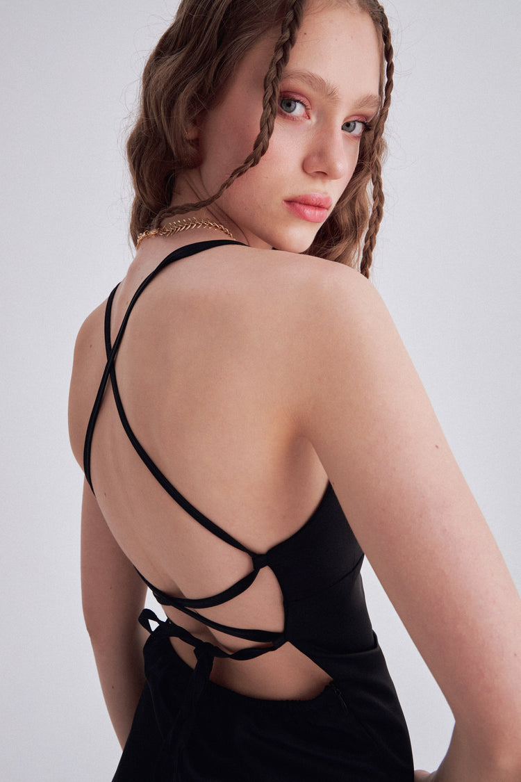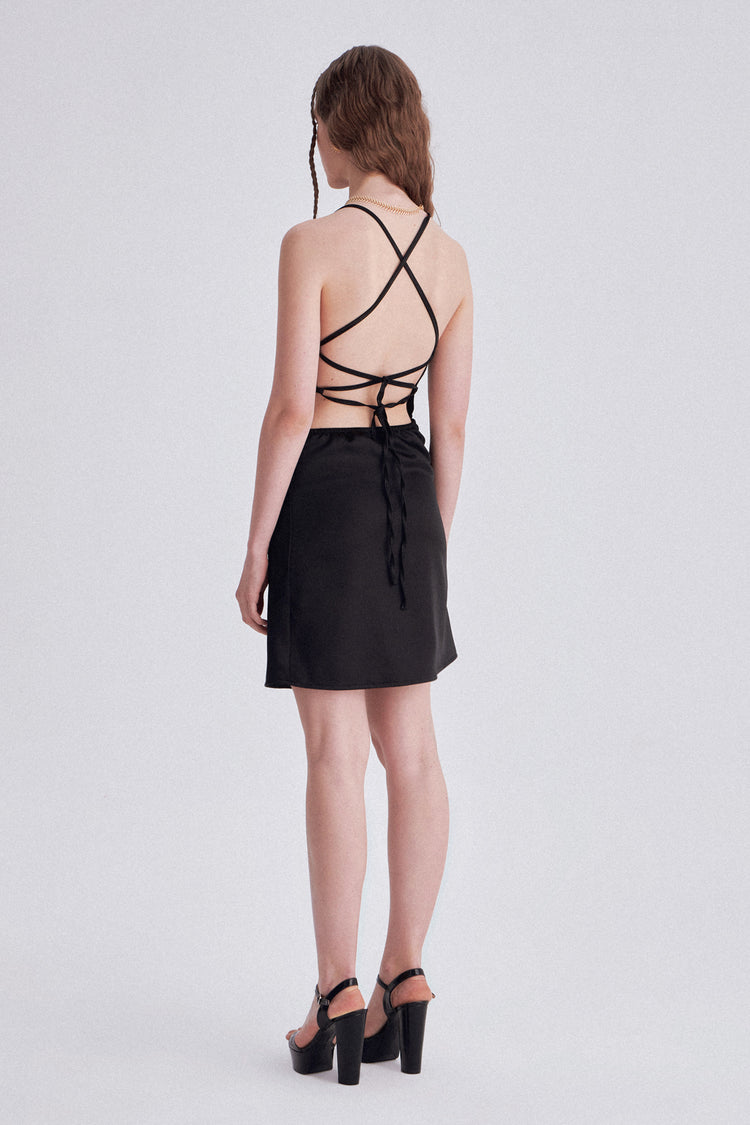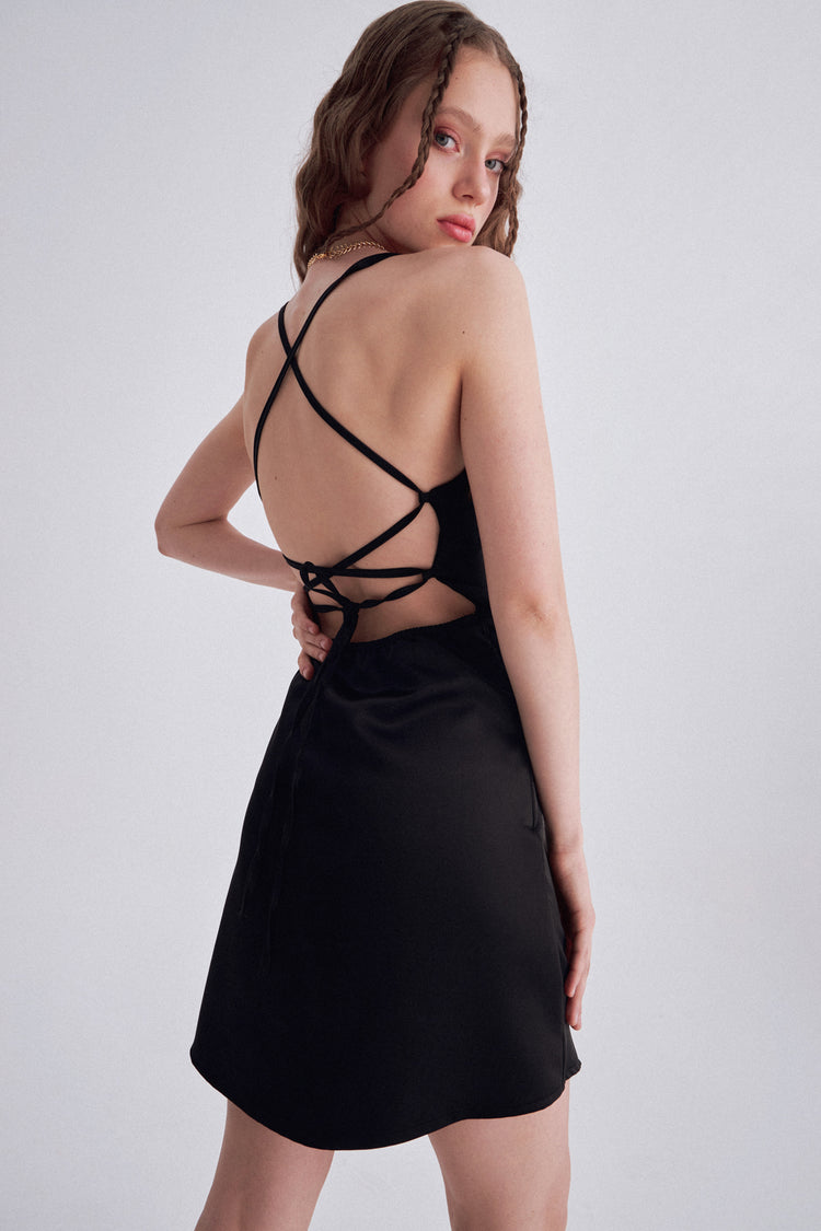 Siyah Sırtı Bağlama Detaylı Mini Saten Elbise