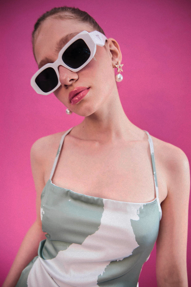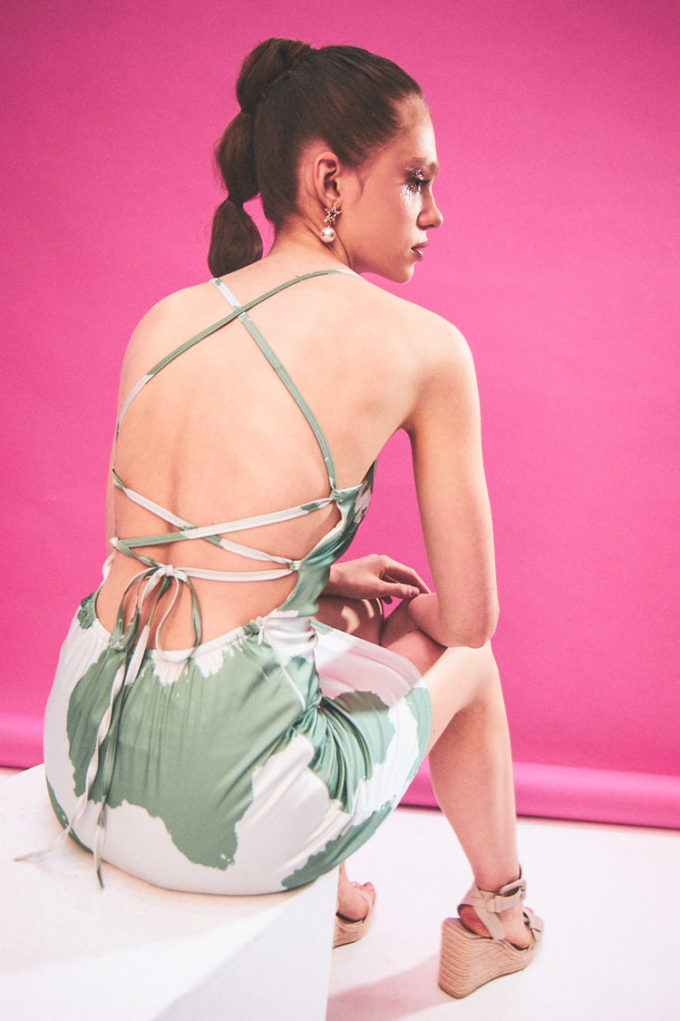 Yeşil Suluboya Desenli Sırtı Bağlama Detaylı Mini Elbise