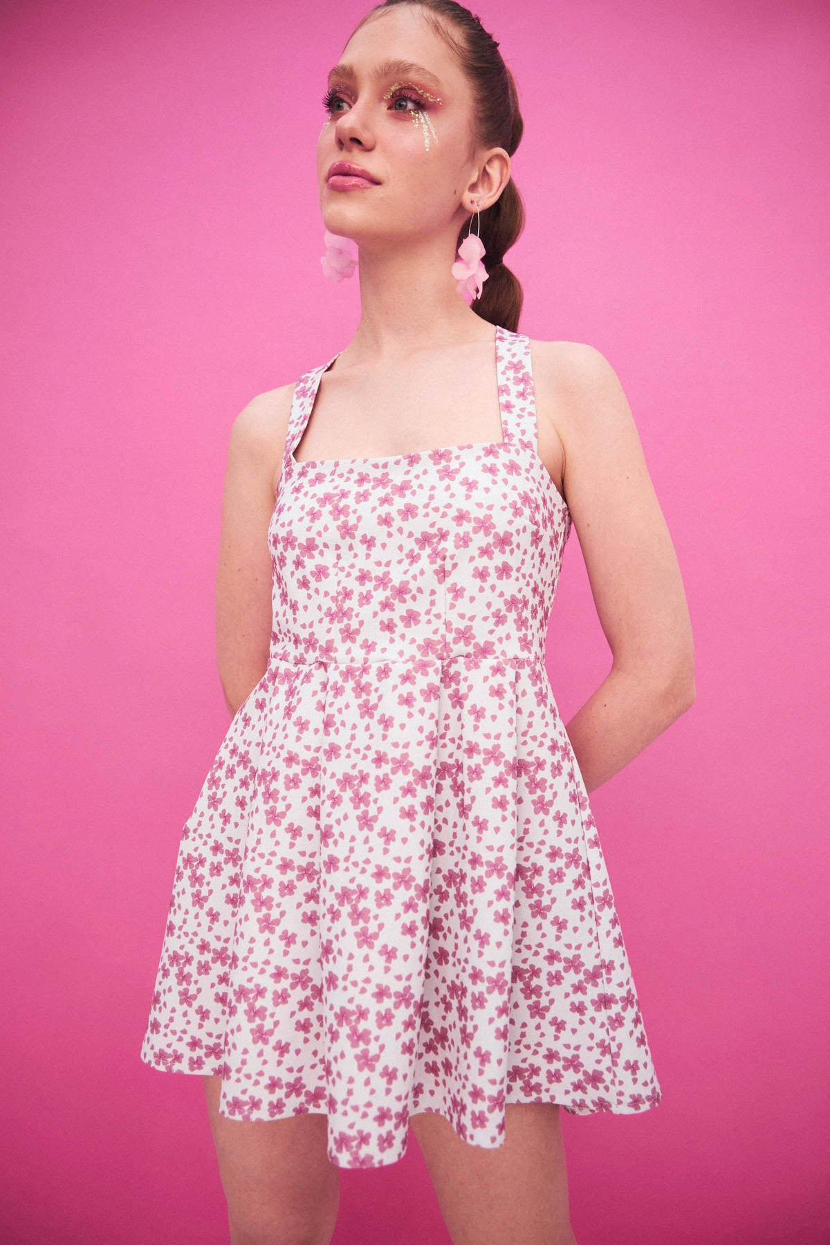 Pembe Çiçek Desenli Sırtı Çapraz Mini Elbise