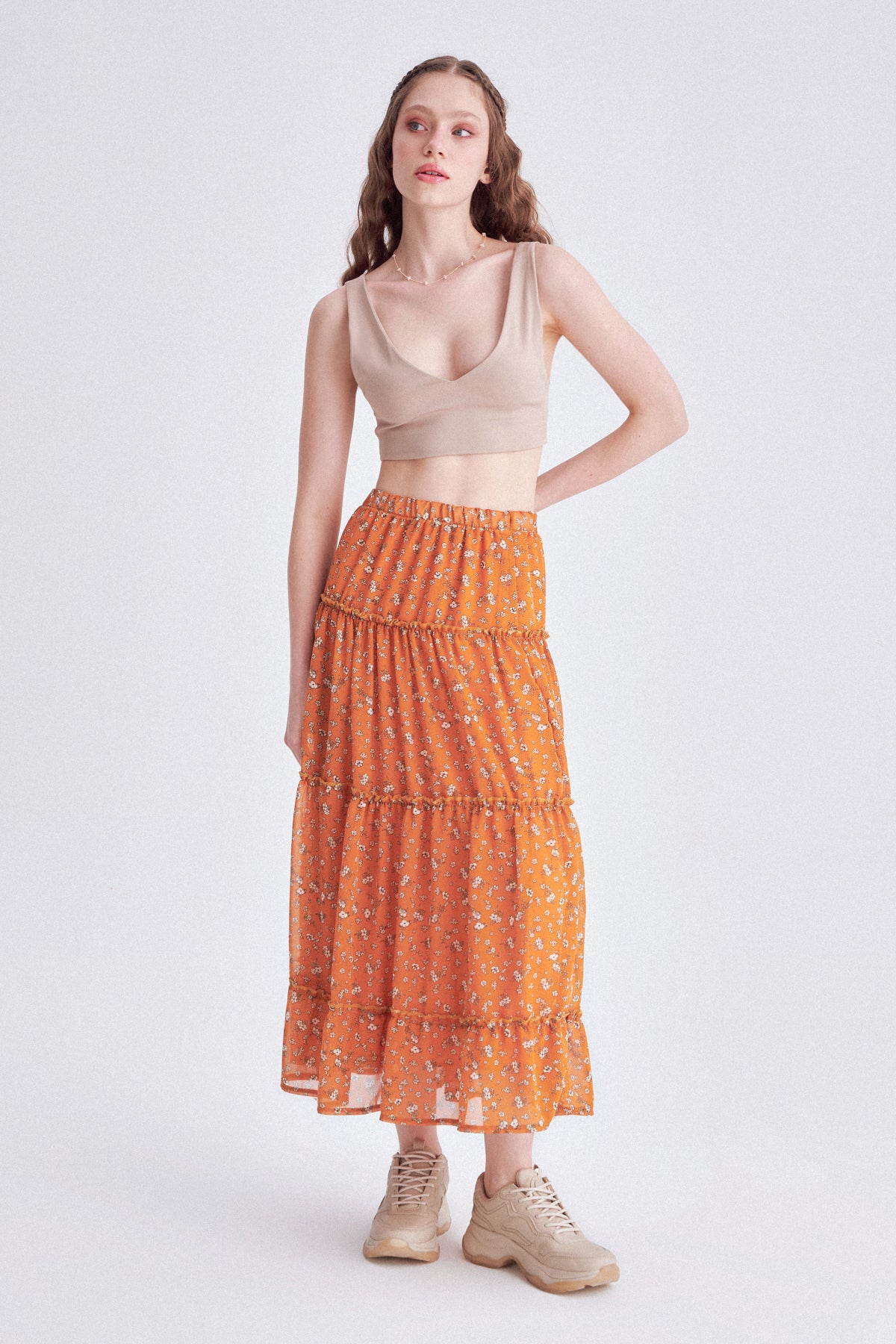 THALIA Turuncu Çiçek Desenli Büzgülü Uzun Etek