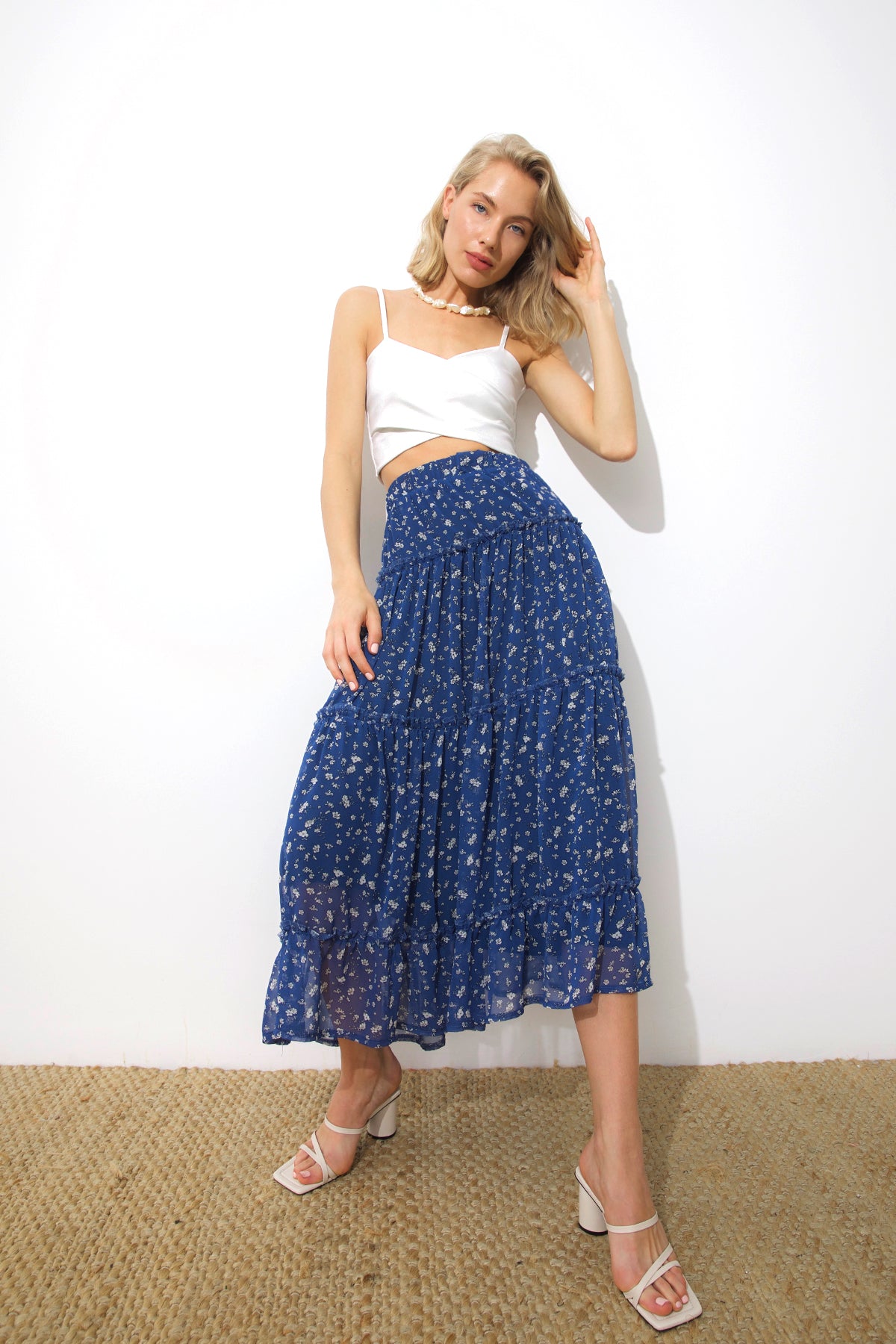 THALIA Mavi Çiçek Desenli Büzgülü Uzun Etek