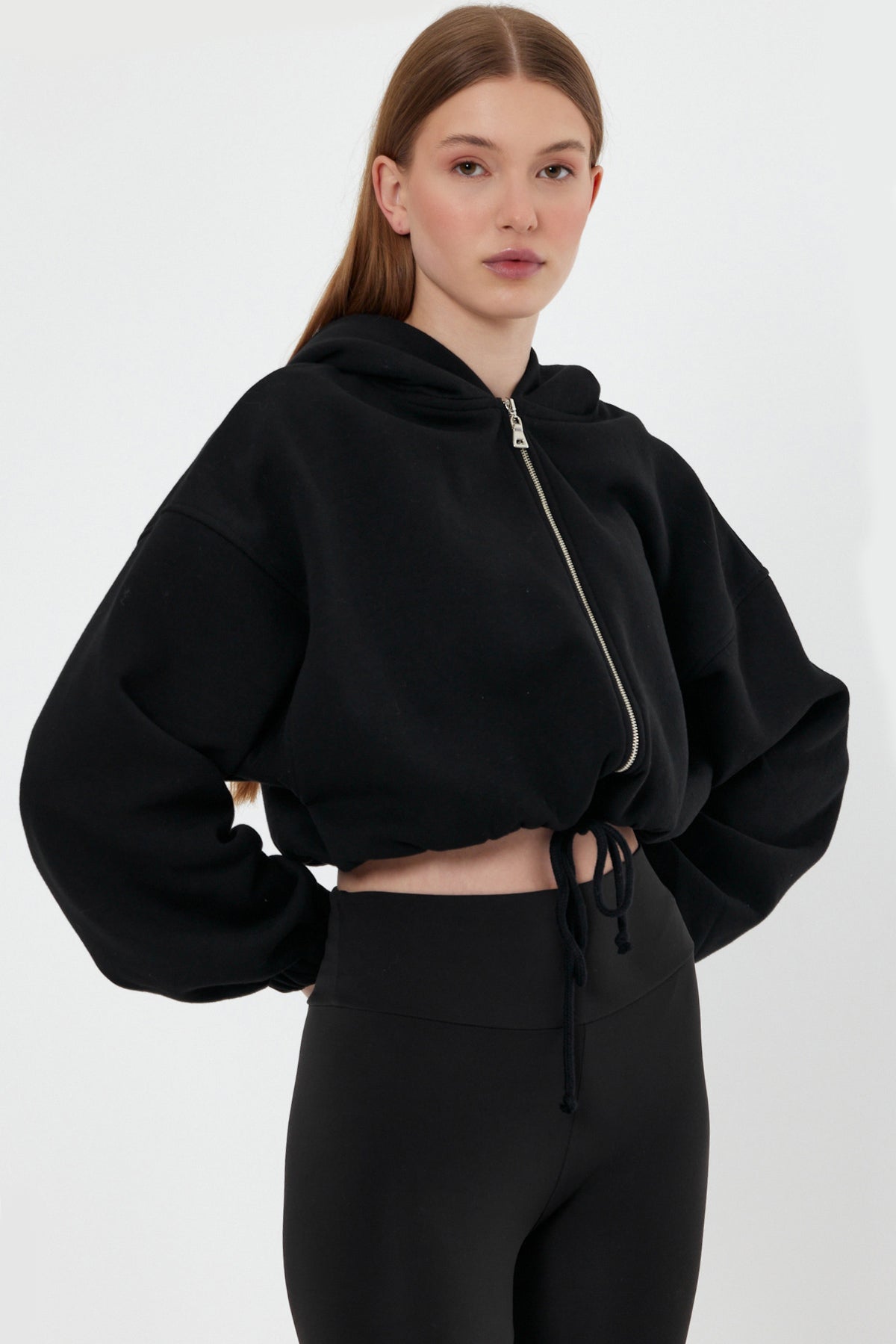 NOVA Siyah Büzgülü Crop Sweatshirt