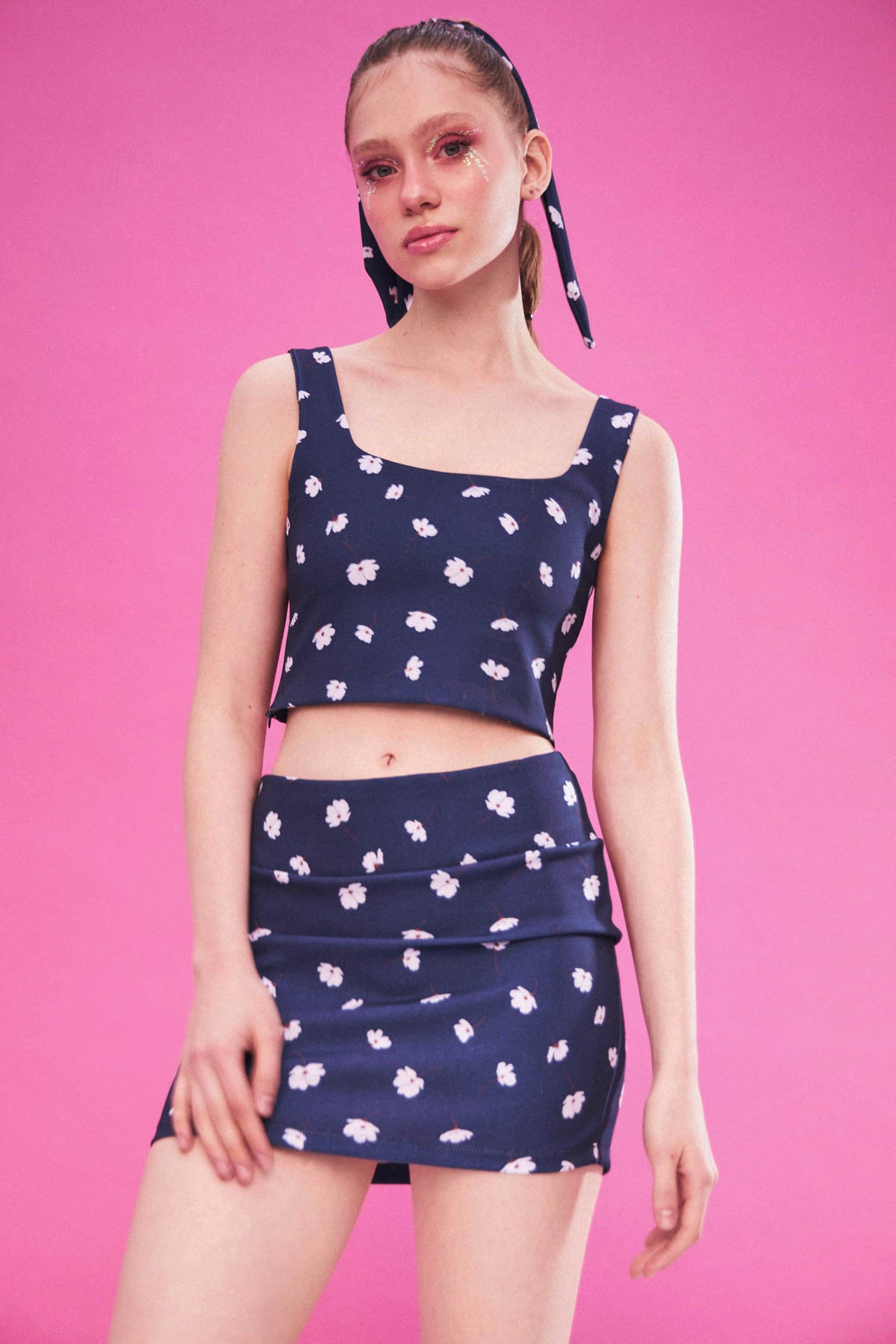 Mavi Çiçek Desenli Mini Etek