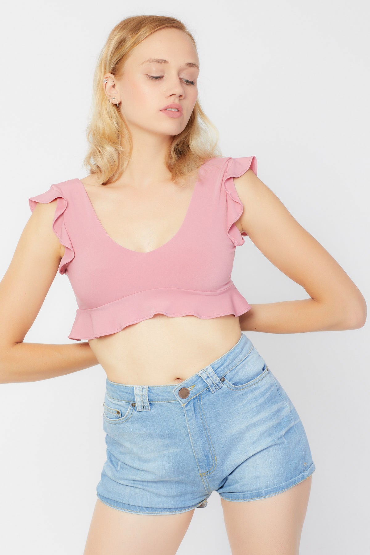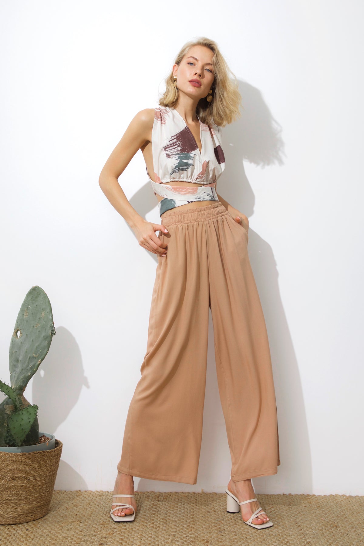 MAIA Bej Çift Askılı Tek Omuz Crop Top
