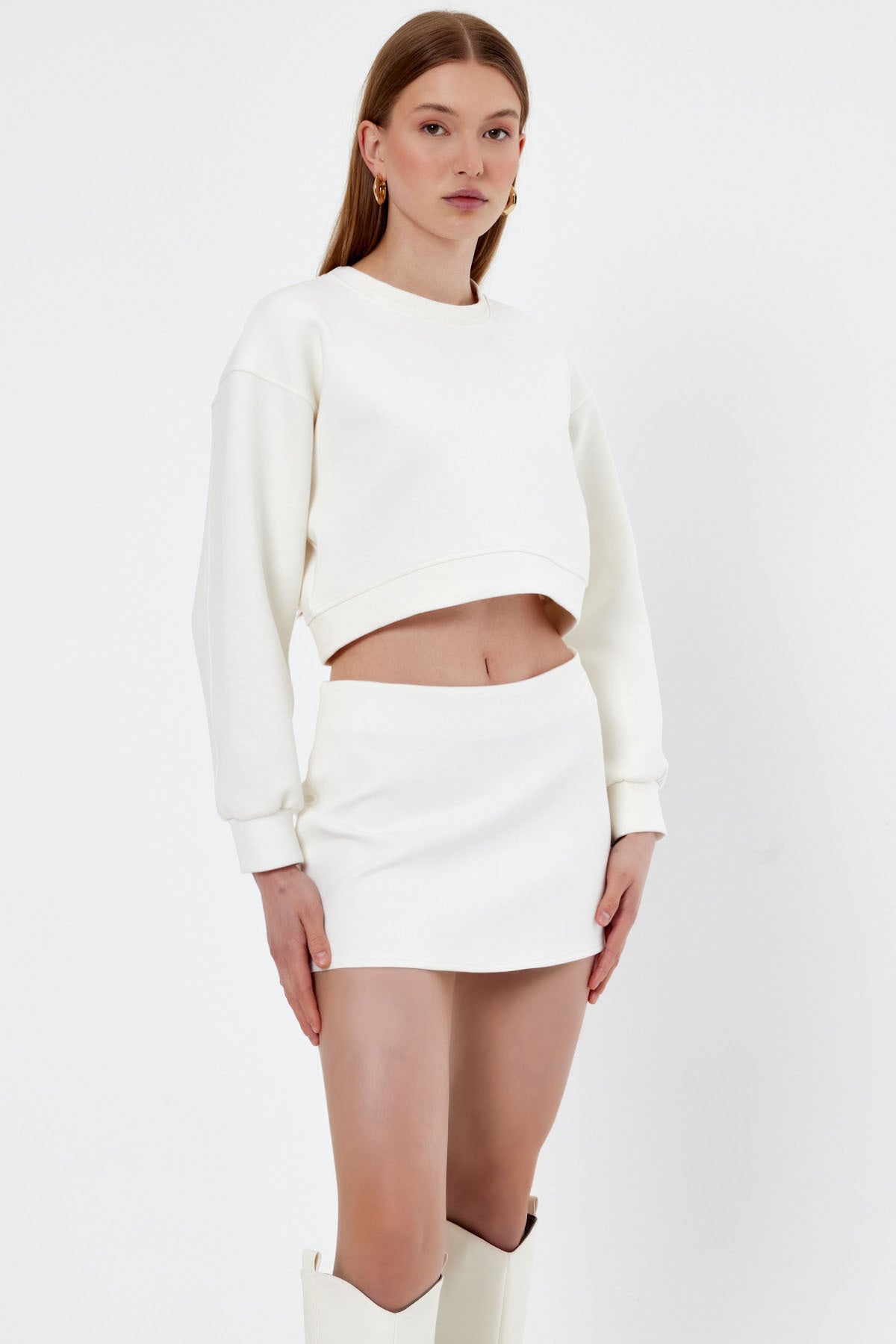 NOVA Beyaz Büzgülü Crop Sweatshirt